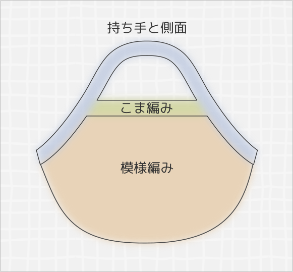 反対側の持ち手と側面も同様に編みます。 - 3段目: